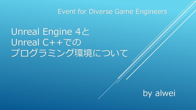 自己紹介 名前 : 中村 匡彦 ネット上では主にalweiという名前で活動中。 Twitterでは『@aizen76』でやっています。 元々はゲームプログラマー。2年前から独立してフリーに。 関西圏を中心にUE4コミュニティの拡大させるために活動中。