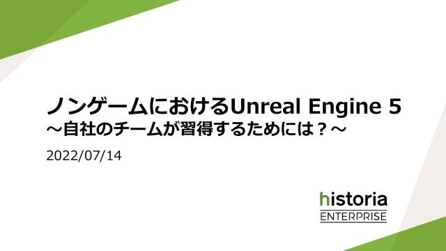 株式会社ヒストリアは、Unreal Engine専門のソフトウェア開発会社です。ゲーム事業とエンタープライズ事業、2 つの軸でソフトウェアの企画、開発を行っています。また、Unreal Engine の学習を目的とした作品制作コンテスト『UE5ぷちコン』や、『出張ヒストリア! ゲーム開発勉強会』を主催、技術ブログを毎週更新など、Unreal Engine コミュニティを盛り上げる活動も行っております。