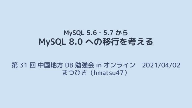 自己紹介 松久裕保(@hmatsu47) ● https://qiita.com/hmatsu47 名古屋で Web インフラのお守り係をしています 以前 MySQL 8.0 の薄い本を作って配っていました ○ Qiita の記事: https://qiita.com/hmatsu47/items/ceb75caf46e3c761095d ○ GitHub リポジトリの他、印刷版を BOOTH で配布していました ○ 2021/5 発行の 8.0.24 対応版を最後に更新停止しました https://note.com/hmatsu47/n/n3ad586c31dce 2