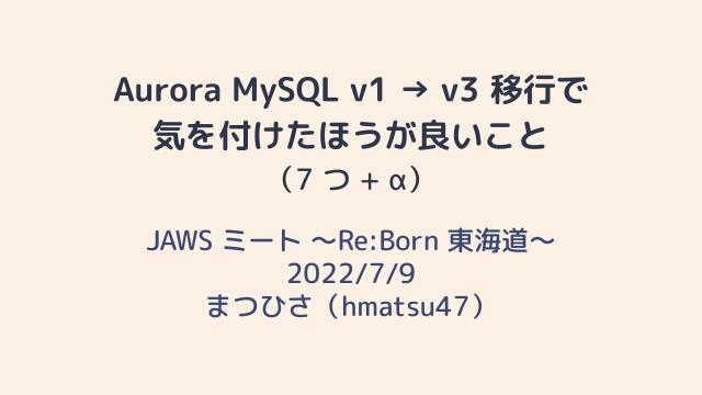 Aurora MySQL v1 → v3 移行の経過報告 JAWS-UG 名古屋 オンラインフリーテーマ会 2022/9/30 まつひさ(hmatsu47)