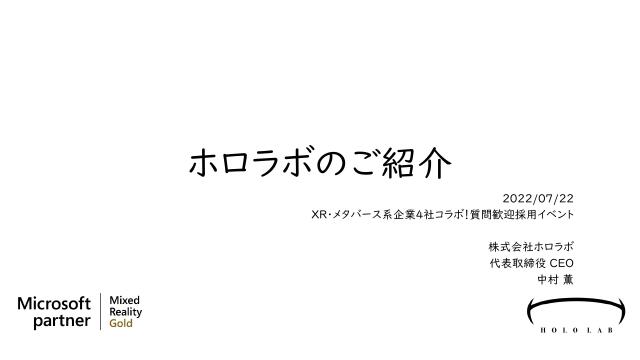 会社概要 株式会社ホロラボ 事業内容 Windows Mixed Reality他、xR技術やセンサー技術に関する ・調査研究 ・システム/アプリケーションの企画開発 ・普及啓発活動 設立 2017/1/18 住所 東京都品川区西五反田2-25-1 インテックス五反田ビル3F 資本金 93,940,000円 (2019/8増資) 取締役 5名 従業員 60名 Web https://hololab.co.jp/ Copyright© HoloLab Inc. All rights reserved 2