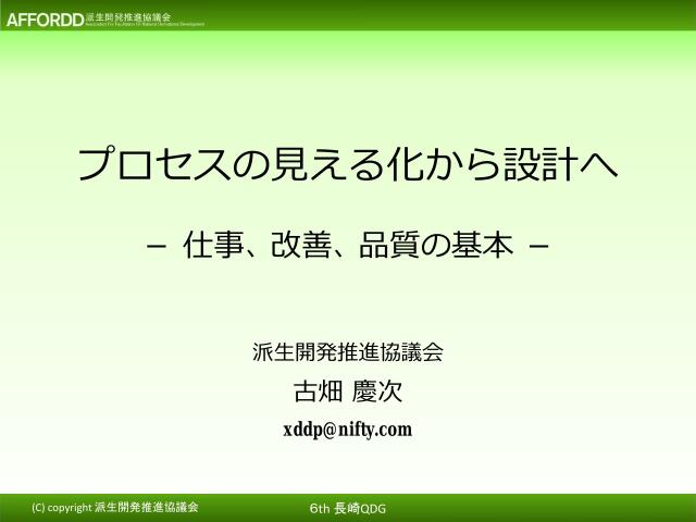 9 AFFORDDコラボセッション 「プロセスの見える化から設計へ ~仕事、改善、品質の基本~」 古畑 慶次 氏 (派生開発推進協議会 副代表) 時代の変化により要求の在り方が変化している。変化する要求へ の対応と品質問題の解決のためには、開発プロセスの変革が必要 である。 AFFORDDでは派生開発を支える3つの技術としてUSDM、 PFD、XDDPを提唱している。今回はPFDについて解説頂いた。 <ポイント> • プロセス設計の必要性 • 利用・開発・業務プロセスを改善・変革するためには、プロセスの 現状・目指す姿・変化点を可視化する必要がある • また、プロセスはプロジェクトごとの要求やリソースなどにより都 度変化する。そのため、プロセスは「定義する(固定する)」という 考えから「設計する」という考え方が重要である • プロセス設計の手段 • プロセスの設計、実行・シミュレーション、改善・改革のためのツ ールとしてPFDが有効である • PFDはプロセスと成果物の連鎖を可視化するツールであり、ダイア グラムと成果物定義書、プロセス定義書で構成される。初めにゴー ル(最終成果物)を設定し、プロセスと中間成果物を設計する ©NaITE AFFORDD: Association for Facilitation Of Rational Derivational Development (派生開発推進協議会) USDM : Universal Specification Describing Manner PFD : Process Flow Diagram XDDP : eXtreme Derivative Development Process 2022/4/15