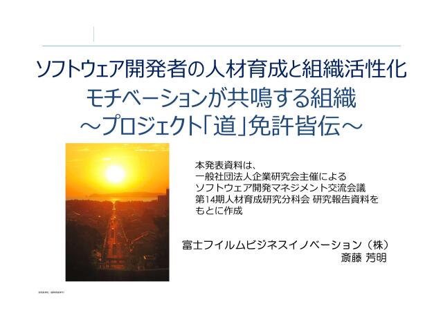 11 特別セッション 「~ソフトウェア開発者の人材育成と組織活性化~ モチベーションが共鳴する組織 「プロジェクト道免許皆伝」」 斎藤 芳明 氏 (富士フイルムビジネスイノベーション株式会社) 個々が継続的な成長を繰り返す組織やプロジェクトづくりの切り 口から人材育成を議論した異業種交流会の研究報告をベースに自 律人材が自ら育つ場つくりについて講演を頂いた。 <ポイント> • プロジェクト道においては、目標はプロジェクトの成功である が、その目的は人間形成である • モチベーションを共鳴・増幅することで、個々が継続的に成長 を繰り返す組織やプロジェクト作りにつながる • モチベーションは「目標の魅力×危機感×達成可能性」で表すこ とができ、心に届き合うコミュニケーションを刺激として増幅 される • プロジェクトを介して人が成長することで、プロジェクト自体 も更に成長する • これらには場つくりが重要である ©NaITE 2022/4/15