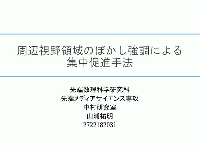 背景 研究目的 従来のインタフェースでコンテンツの印象に合った 文字デザインを行うことは難しい ユーザのデザインに関する知識や経験に依存せず 文字デザインが容易なインタフェースの実現 手法 ① フォントを数式化し融合する手法 ② フォントの印象空間を操作することで動的にフォントを 生成するインタフェース 実験 • 従来インタフェースとの比較実験 • 生成されたフォントの妥当性の検証 結果 • 提案手法 > 従来手法 • 任意の組み合わせで融合されたフォントは 概ね期待通りの印象をもつ