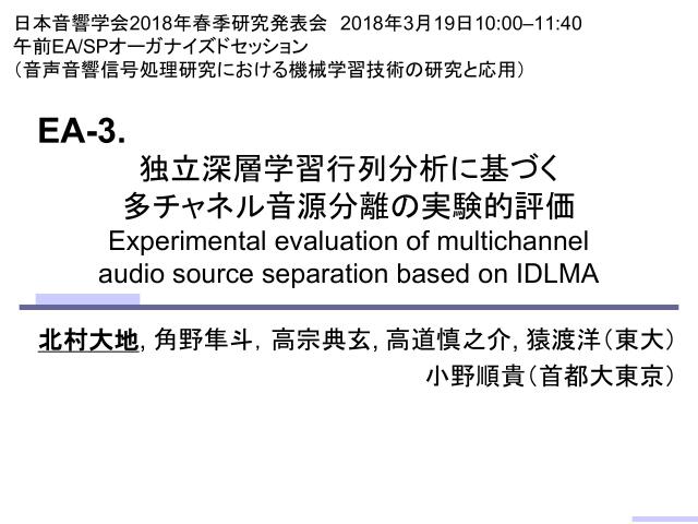 独立深層学習行列分析に基づく多チャネル音源分離の実験的評価(Experimental evaluation of multichannel audio source separation based on IDLMA)