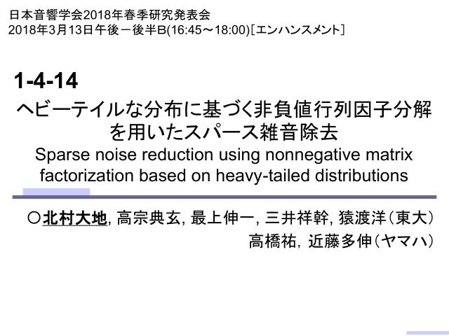 ヘビーテイルな分布に基づく⾮負値⾏列因⼦分解を⽤いたスパース雑⾳除去(Sparse noise reduction using nonnegative matrix factorization based on heavy-tailed distributions)